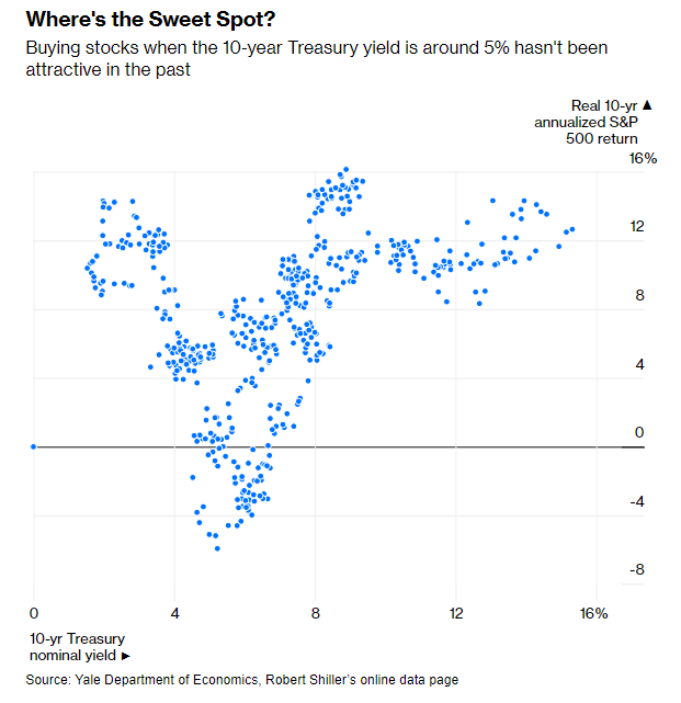 Il rendimento dei titoli del Tesoro a 10 anni ha superato il 5% la scorsa settimana per la prima volta in 16 anni. Tassi a lungo termine più elevati stanno spingendo molti investitori dalle azioni alle obbligazioni. L’effetto dei tassi di interesse sui rendimenti azionari è complesso e Wall Street sta valutando se il livello del 5% sia un segnale per scaricare le azioni e riversarsi sulle obbligazioni. Cerchiamo di capirlo attraverso i dati storici.