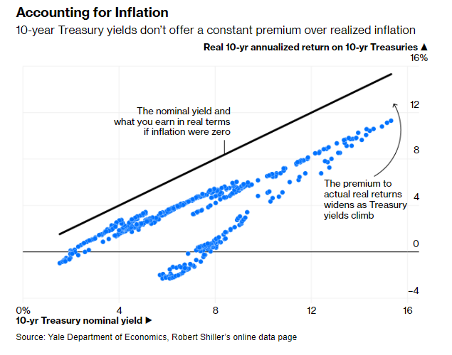 Si nota anche che una volta che i rendimenti nominali raggiungono il 5%, c’è il rischio che l’inflazione sia più alta del solito 2,5% circa in quell’intervallo. Il rischio di inflazione inaspettata diminuisce con l’aumento dei tassi del Tesoro a 10 anni, sia perché scende in termini assoluti, sia perché si ha un rendimento nozionale più elevato per compensarlo.