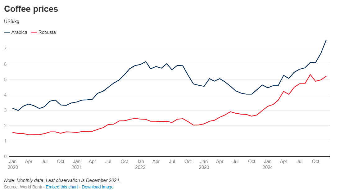 Il caffè è una bevanda irrinunciabile per milioni di persone, ma il suo prezzo sta diventando sempre più caro. Nel 2024 il prezzo dell’Arabica ha raggiunto i 3,47 dollari per libbra, il livello più alto dal 1977. E il 2025 non promette miglioramenti. Le cause? Principalmente climatiche: