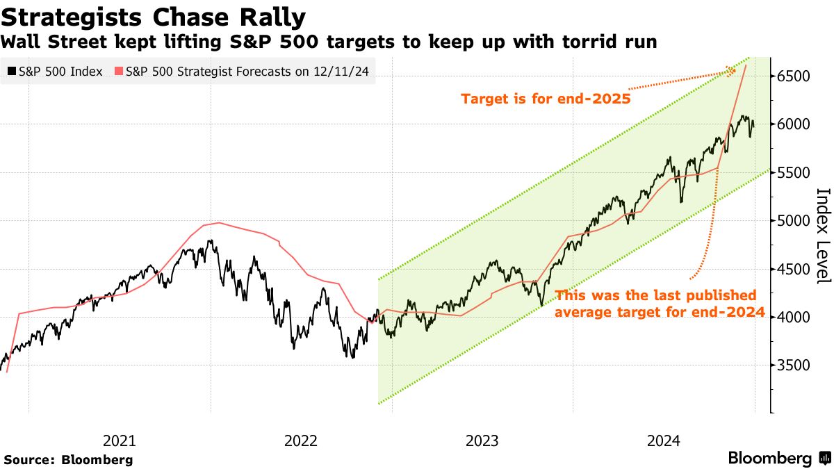 L’S&P 500 ha chiuso l’anno con un impressionante +23%, dopo un già solido +24% del 2023. Si tratta del primo biennio consecutivo di guadagni sopra il 20% dagli anni ’90. Nonostante ciò, le previsioni degli esperti rivelano che il 2025 potrebbe non essere altrettanto esplosivo per il mercato azionario USA.
