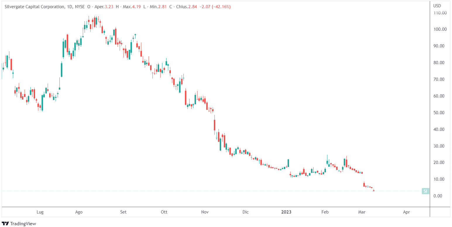 Giovedì le azioni di Silvergate sono scese del 42% a $ 2,5. Il titolo aveva superato i $ 220 nel novembre 2021.