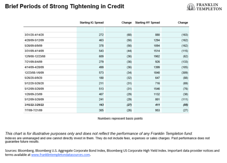 Marzo è stato un mese unico in cui abbiamo assistito all’allargamento dei credit spread seguito da un drastico restringimento. Ciò è avvenuto in un momento in cui gli spread erano vicini ai loro minimi storici. È possibile che questo sia un assaggio del comportamento che si osserverà per il resto dell’anno.