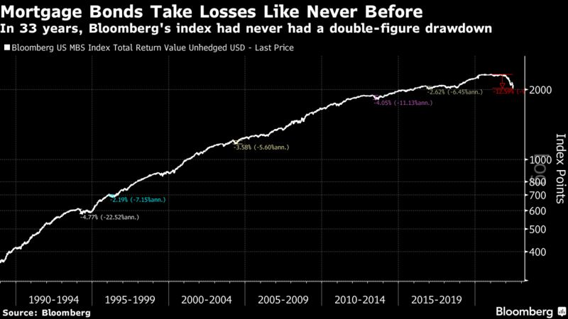 Con una perdita del 12%, i titoli garantiti da ipoteca hanno resistito molto meglio delle azioni. Tuttavia questo è un mercato in cui gli investitori non si aspettano di dover sopportare dei drawdown. Nel contesto storico, quello che è successo alle obbligazioni garantite da ipoteca quest’anno è una svolta radicale. L’indice di Bloomberg risale al 1988, quando l’asset class era ancora agli albori. Questa è la prima volta che ha resistito a un declino a doppia cifra.