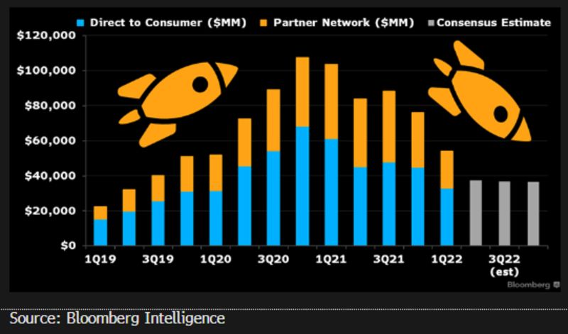 Si prevede che la produzione di mutui subirà un forte calo. Le previsioni di consenso prevedevano un volume di 292 miliardi di dollari quest’anno all’inizio del 2022. Ora sono scese a $ 164 miliardi. Ecco i numeri per trimestre, con le proiezioni per il resto di quest’anno: