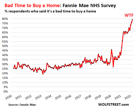 I prezzi delle case alle stelle da finanziare con tassi ipotecari in aumento, l’incertezza sull’economia, il calo dei prezzi delle azioni e l’inflazione creano un mix tossico per gli acquirenti di case. La percentuale di persone che pensa che adesso sia un brutto momento per comprare una casa è balzata al 79%, un altro record nei dati che risalgono al 2010.