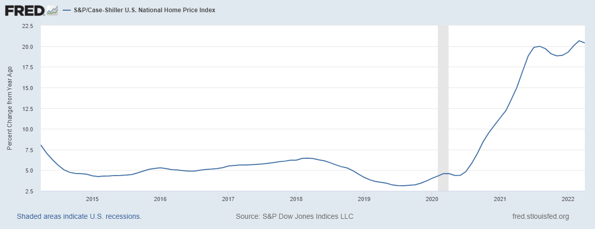 La lettura del Case-Shiller, pur guardando indietro all’inizio di quest’anno, riflette comunque la folle corsa all’acquisto di una casa per bloccare i tassi ipotecari in vista del loro aumento. L’indice è salito del 2,1% ad aprile da marzo, ma è sceso dal picco del 2,6%. Su base annuale, l’indice è aumentato del 20,4%, scendendo dal picco del 20,6% del mese precedente.