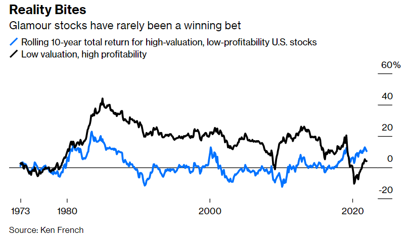 Le volte in ​​cui le azioni costose e a bassa redditività hanno battuto quelle economiche e altamente redditizie sono raggruppate in soli due periodi. Le azioni speculative erano molto richieste durante la fine degli anni ’60 e l’inizio degli anni ’70. Lo sono state anche negli ultimi anni. Allora, come oggi, la convergenza tra l’innovazione e un mercato rialzista ha invogliato gli investitori a inseguire società in rapida crescita con poca considerazione per i profitti o la valutazione. Nel successivo mercato ribassista biennale iniziato nel 1973, i titoli ad alta crescita furono colpiti più duramente e le società economiche e altamente redditizie li superarono negli anni successivi.