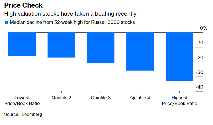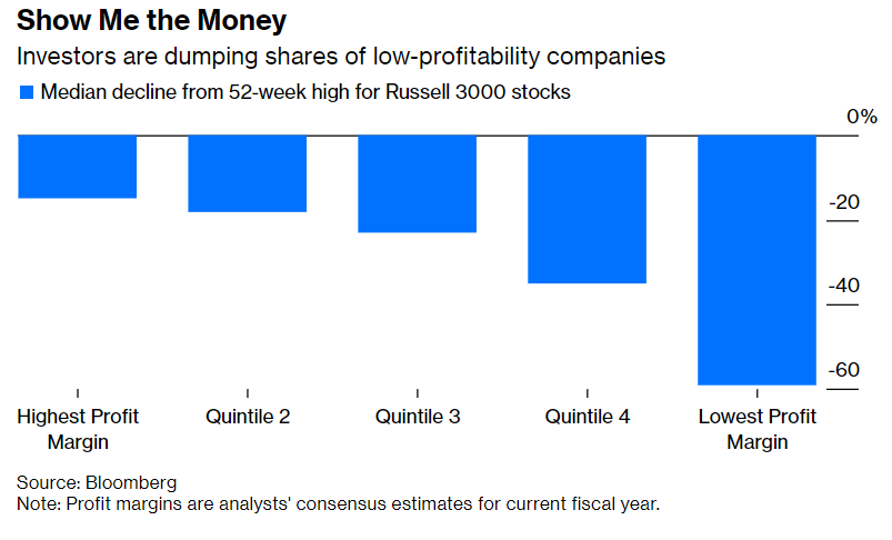 Il recente crollo è davvero sbalorditivo. Il calo medio dal massimo in 52 settimane per i titoli nel quintile delle aziende più redditizie del Russell è stato del 15%. Le perdite aumentano ad ogni quintile successivo, arrivando a un calo medio del 59% per il gruppo meno redditizio.