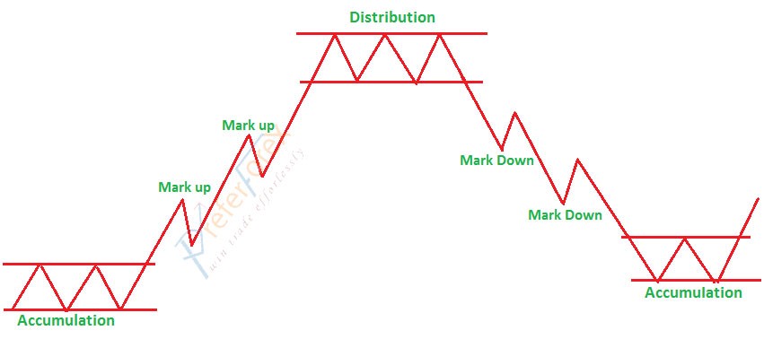 In genere le fasi di accumulazione e di distribuzione sono laterali, mentre quella di partecipazione del pubblico è il trend vero e proprio che nasce dal breakout della fase laterale. Quando il trend è rialzista, la fase di partecipazione è chiamata mark-up. Il mark-down caratterizza invece i trend ribassisti.