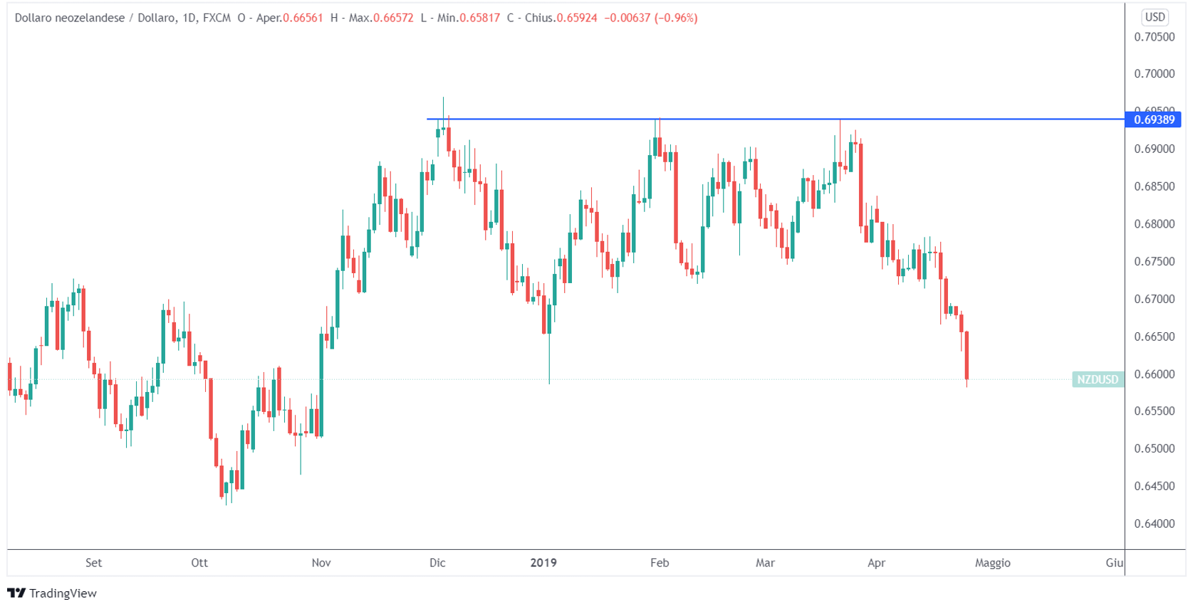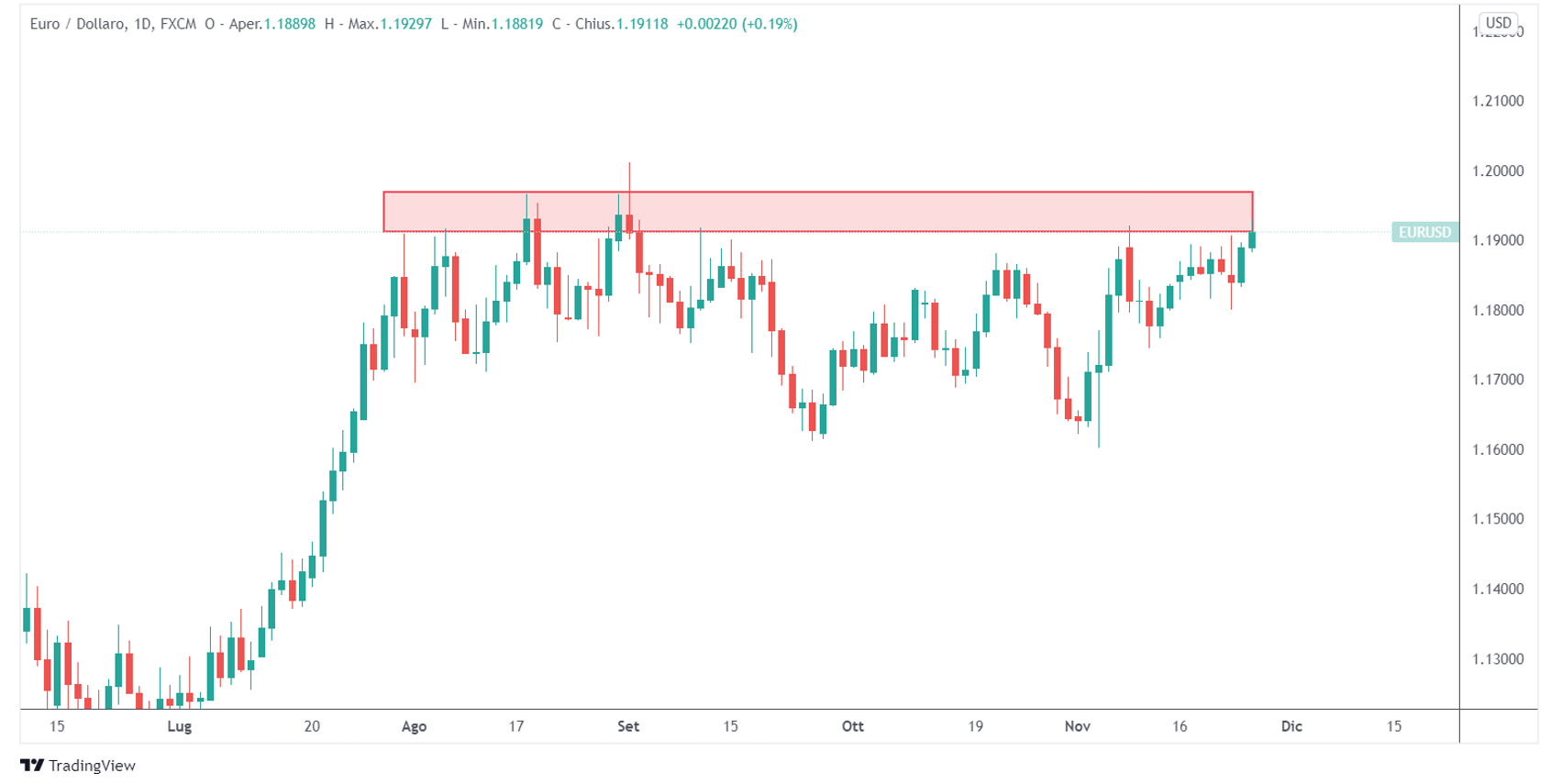 Una resistenza è un livello chiave posto al di sopra del prezzo attuale del sottostante. Si tratta di un punto in cui l’offerta dello strumento finanziario è aumentata in passato, spingendo al ribasso il prezzo. Sul grafico rappresenta un livello in cui il prezzo ha più volte reagito al ribasso.