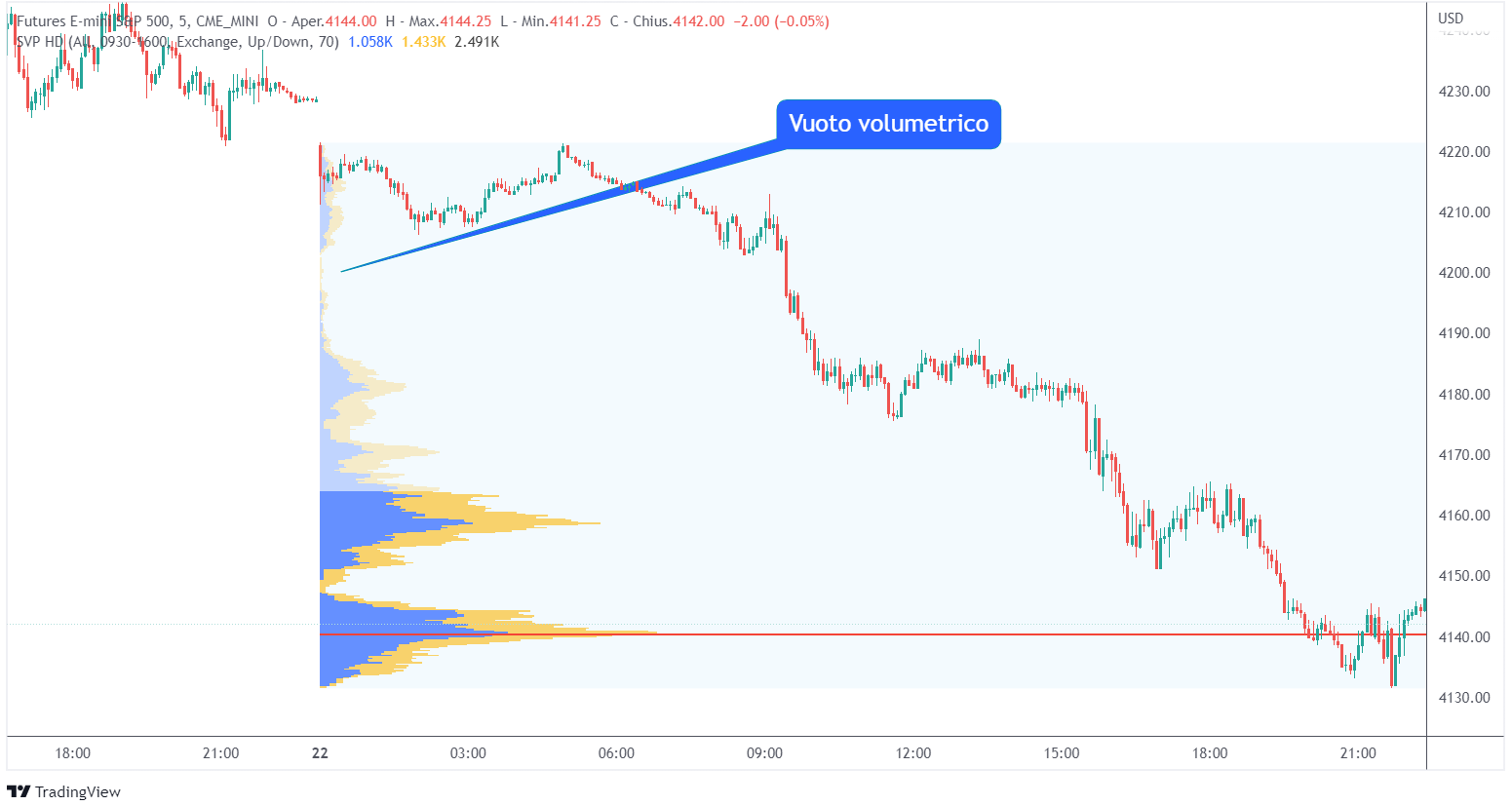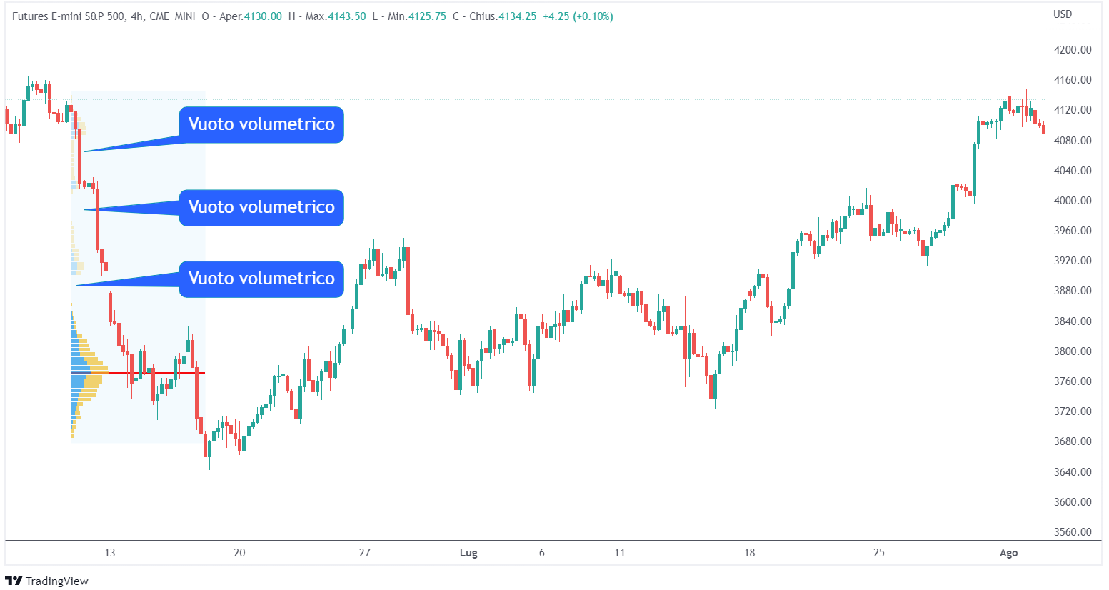 Questi punti agiscono come “gallerie” nel senso che, quando il prezzo ci si ritrova, non incontra alcuna difficoltà ad oltrepassarli. Quindi il mercato in queste zone incontra poco interesse a scambiare e passa velocemente in aree con una maggiore concentrazione dei volumi.
