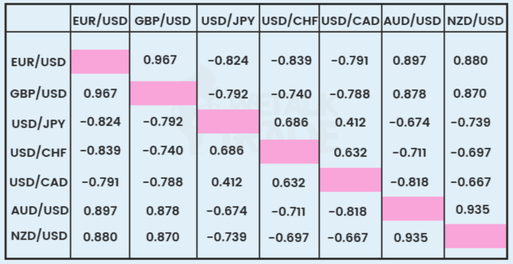 Eur/Usd è correlato positivamente con Gbp/Usd, mentre negativamente con i cross che hanno il dollaro al nominatore.