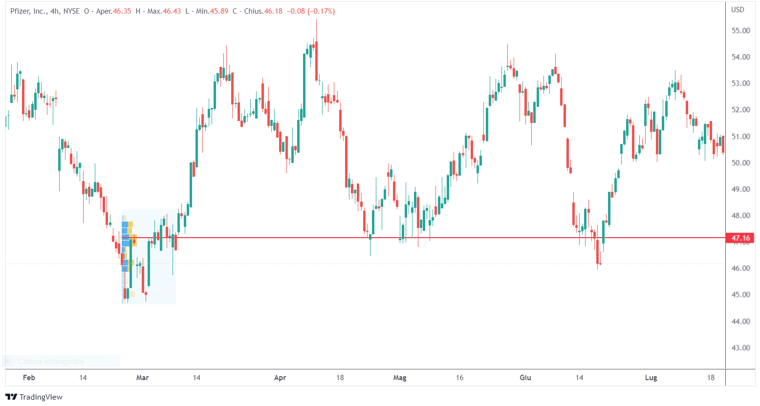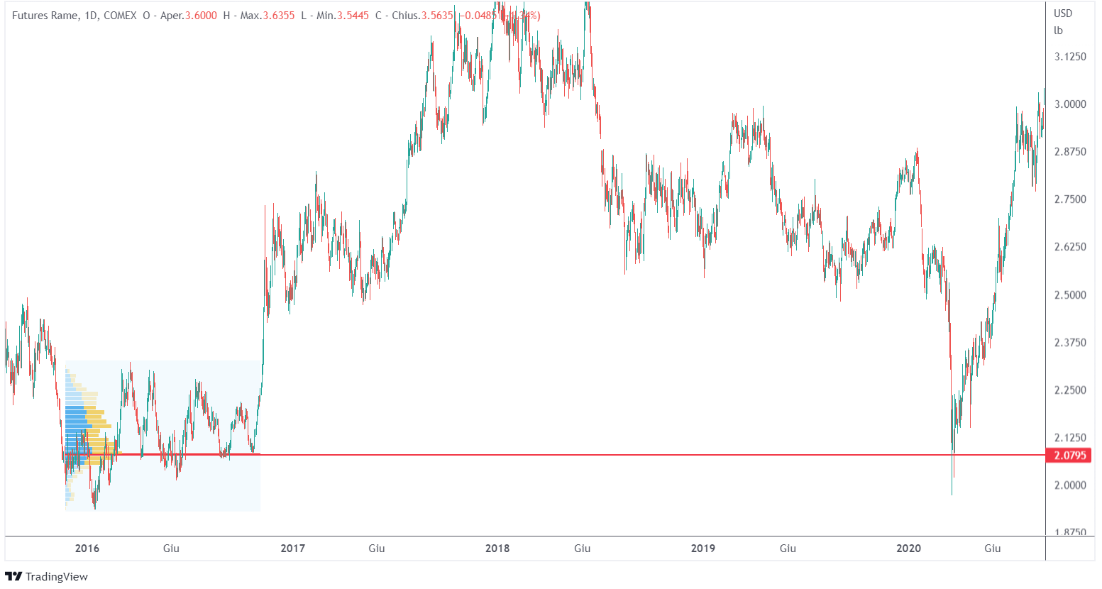 Il prezzo era in una fase di trend prima di rallentare e, in seguito, invertire bruscamente. Sul grafico è tracciato il volume profile dell’impulso ribassista associato alla rotazione. Si può notare che il prezzo ha reagito per ben due volte in prossimità del POC