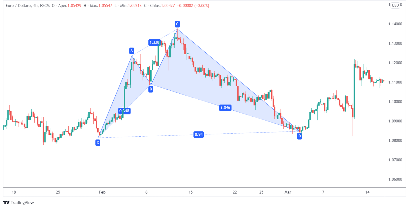 Il punto C deve essere compreso tra l’estensione 1.272 e 1.414 di XA. Se supera l’estensione 141,4 il pattern non è valido.
