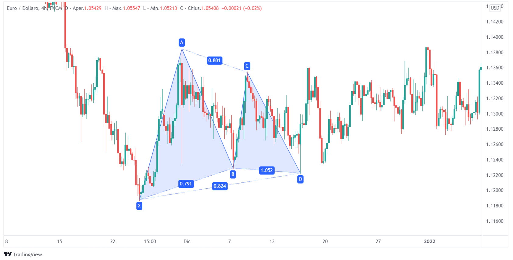 Ogni punto all’interno della struttura segue determinati rapporti di Fibonacci ed è importante sottolineare che il punto D non rappresenta un punto preciso, ma una zona di inversione in cui il prezzo è più probabile che cambi direzione.