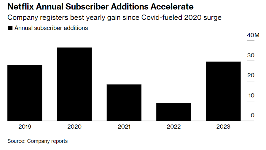 Netflix ha aggiunto 13,1 milioni di clienti nel quarto trimestre del 2023, che è stato il migliore dalla pandemia per la crescita del gigante dello streaming. Il numero ha superato la stima di Wall Street di 8,91 milioni. Netflix ha aggiunto più di 5 milioni di clienti solo in Europa, Medio Oriente e Africa. Anche le vendite hanno superato le previsioni salendo a 8,83 miliardi di dollari.