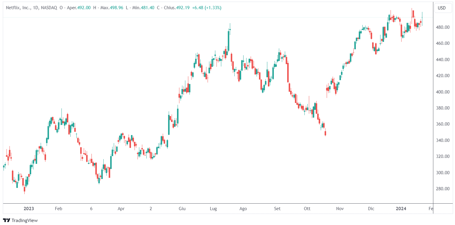 Gli utili sono aumentati a 2,11 dollari per azione, un numero inferiore alle previsioni di Wall Street. Netflix ha generato un utile netto di 5,41 miliardi di dollari per l’intero anno scorso e ha chiuso il 2023 con 7,1 miliardi di dollari in liquidità e investimenti a breve termine. Il titolo è aumentato dell’8,9% a 535,91 dollari nel trading post-market dopo l’annuncio degli utili.