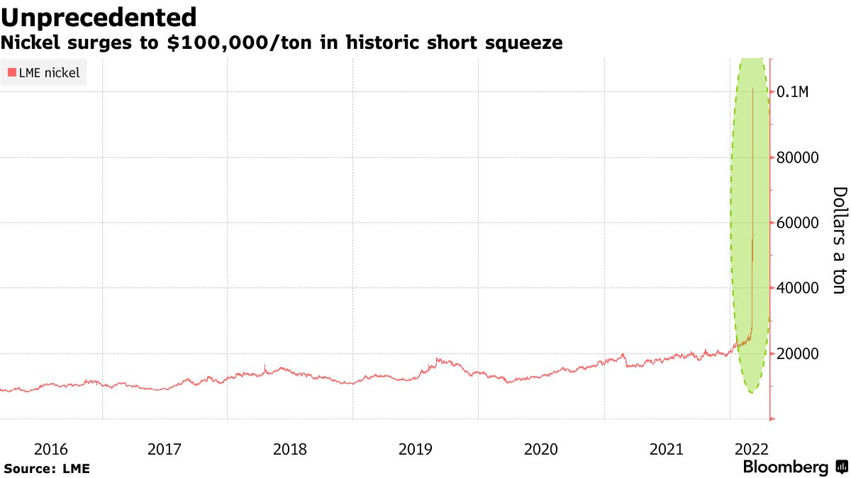 Martedì mattina Il London Metal Exchange ha sospeso il commercio di nichel dopo che i prezzi sono aumentati fino al 250% in due sessioni. In seguito l’exchange ha annunciato che avrebbe cancellato tutte le operazioni avvenute nelle ore precedenti all’arresto. Il picco di prezzo mozzafiato è stato innescato da un potente short squeeze sul nichel, con i detentori di posizioni short, incluso il principale produttore Tsingshan, che si sono precipitati a chiuderle.