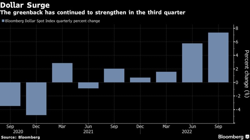 L’indice Dollar Spot di Bloomberg, che misura la valuta rispetto a un paniere di controparti dei mercati sviluppati ed emergenti, è salito di oltre il 15% quest’anno. Il dollaro ha toccato nuovi massimi storici questa settimana ed è salito di circa il 7% nel terzo trimestre.