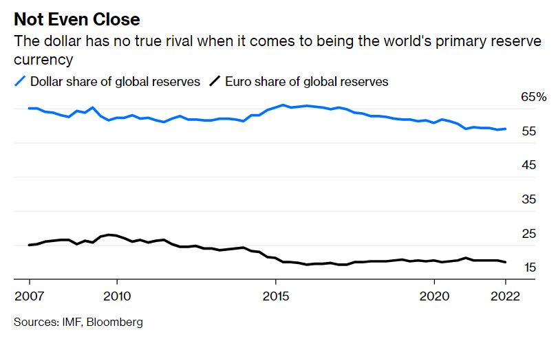 Secondo il Fondo Monetario Internazionale, la quota del dollaro sulle riserve globali si attesta al 58,9%, ben al di sopra dell’euro al 20,1%. Dopo l’euro, lo yen giapponese rappresenta solo il 5,36% delle riserve totali. Sebbene la quota del dollaro sia scesa negli ultimi anni da circa il 70%, è ancora al di sopra dei minimi di circa il 45% nei primi anni ’90.