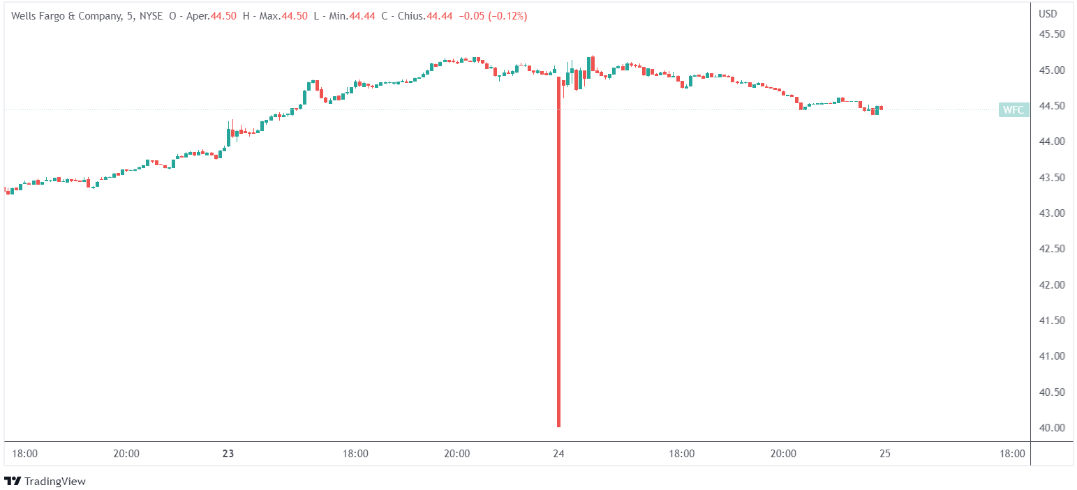 I problemi tecnici hanno coinvolto almeno 40 azioni dell’indice S&P 500. Wells Fargo, che ha chiuso lunedì a $ 45,03, è sceso fino a $ 38,10 in apertura. Allo stesso modo, Morgan Stanley è precipitato a $ 84,93 dopo aver chiuso a $ 97,13 lunedì. Walmart e McDonald’s sono saliti e poi sono scesi fino al 12% prima di tornare a intervalli di negoziazione più normali.