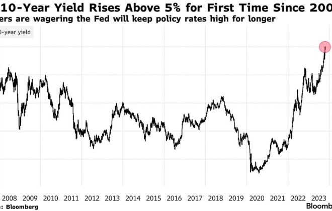 Lunedì i rendimenti dei Treasury a 10 anni hanno superato il 5% per la prima volta dal 2007. L’aumento ha innescato il caos tra gli investitori, ma è improbabile che susciti preoccupazioni presso la Federal Reserve a meno che non diventi più volatile o persistente….