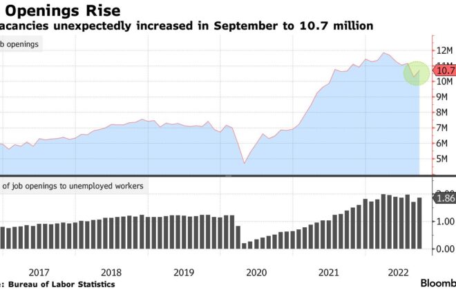 Le offerte di lavoro negli Stati Uniti sono rimbalzate inaspettatamente a settembre, mantenendo la pressione sulla Federal Reserve per estendere la sua campagna aggressiva di aumento dei tassi d’interesse per frenare l’inflazione. Il numero di posti vacanti è aumentato a 10,7 milioni a settembre da…