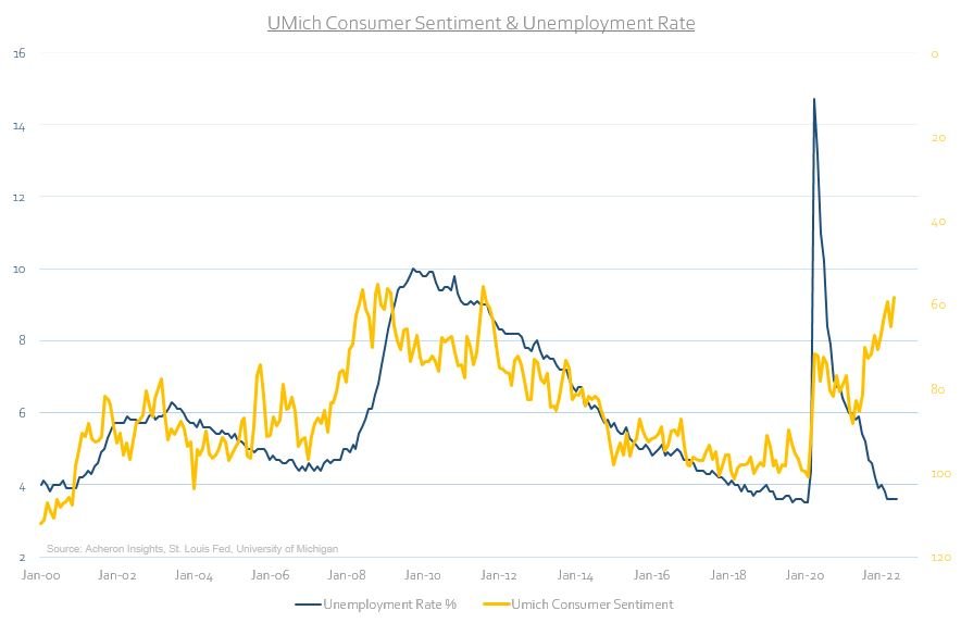 L’aumento dell’inflazione e il suo impatto sui redditi reali stanno pesando sul sentiment dei consumatori. Se osserviamo l’indice del sentiment dell’Università del Michigan, possiamo notare come storicamente ha anticipato di circa 6-12 mesi l’aumento del tasso di disoccupazione.