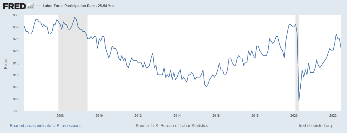 Il tasso di disoccupazione si trova ai minimi dei cicli recenti. Tuttavia, il raggiungimento di tali livelli è più facile quando il tasso di partecipazione alla forza lavoro è ben al di sotto dei massimi del ciclo precedente, soprattutto quello relativo alla fascia demografica più importante dal punto di vista della produttività, ovvero quella tra i 25 e i 54 anni.