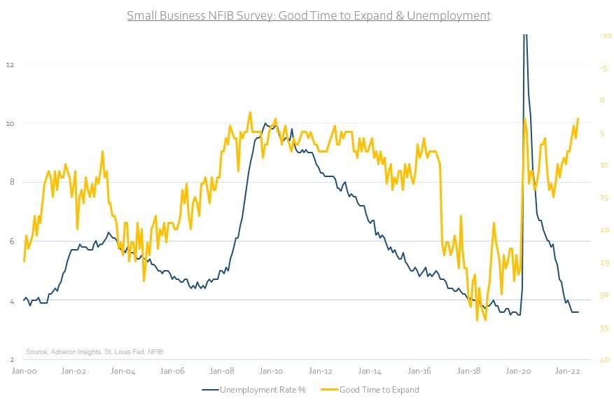 Secondo l’ultima indagine del NFIB, il numero di piccole imprese che pensa che sia un buon momento per espandere la forza lavoro (in scala invertita nel grafico che segue) si avvicina ai minimi degli ultimi dieci anni, un risultato che generalmente ha preceduto l’aumento della disoccupazione. Allo stesso tempo, la percentuale di piccole imprese che intende aumentare l’occupazione è in calo.