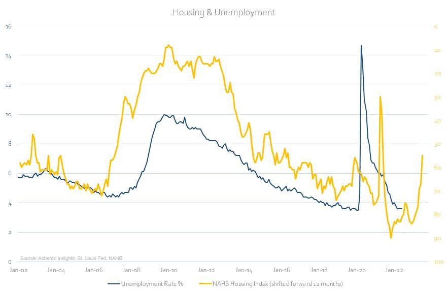 Altrettanto importante per l’attività economica degli Stati Uniti è il mercato immobiliare. Secondo la National Association of Homebuilders, gli investimenti immobiliari, l’edilizia e i consumi correlati contribuiscono a circa il 15-18% del PIL. Dai dati sulle vendite e sull’inventario di case possiamo già osservare il rallentamento del mercato immobiliare. Inoltre, il sentiment dei costruttori di case è crollato ad uno dei ritmi più veloci di sempre. In genere, l’indice NAHB tende a guidare la disoccupazione di circa 12 mesi.