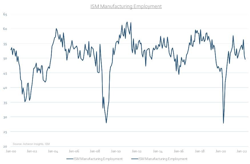 In primo luogo, è importante osservare le tendenze occupazionali nel settore manifatturiero. Quest’area dell’economia è di natura ciclica ed è molto importante per la crescita. Quando l’economia rallenta, nella maggior parte dei casi l’aumento del tasso di disoccupazione si manifesterà prima di tutto nel settore manifatturiero. Ecco che un’indicatore affidabile è dato dalla componente relativa all’occupazione del PMI dell’ISM. L’ultima lettura ha mostrato che l’occupazione del settore manifatturiero è passata in territorio di contrazione.