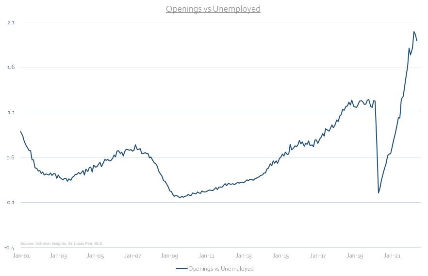Ci sono alcuni segnali che indicano che la crescita salariale potrebbe raggiungere il picco. Confrontando il numero di offerte di lavoro rispetto ai disoccupati, possiamo vedere che la crescita salariale si è spostata seguendo l’andamento di questo rapporto.