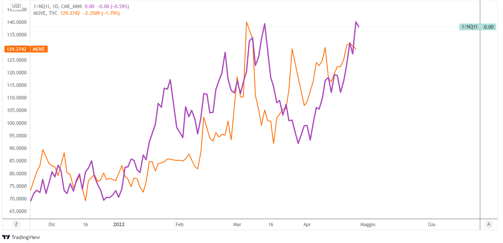 Da inizio 2022, la volatilità del Nasdaq ha visto ben 4 picchi. L’ultimo sprazzo si è andato a posizionare sullo stesso livello degli ultimi due. La candela di ieri ha chiuso vicino ai 39 punti. Solitamente, valori al di sopra dei 25 sono considerati medio/alti.