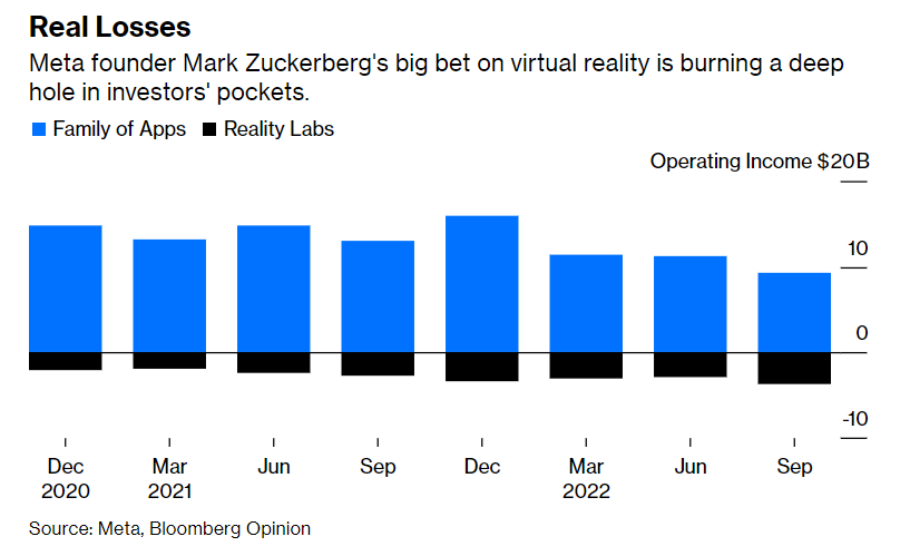 Nel frattempo, la società di social media sta bruciando soldi per la sua divisione Reality Labs, la grande scommessa del fondatore Mark Zuckerberg sulla realtà virtuale e il metaverso che ha ispirato il cambio di nome dell’anno scorso. Quella direttrice di business ha perso più di $ 20 miliardi fino ad oggi e Zuckerberg ha detto agli investitori di aspettarsi ulteriori perdite.