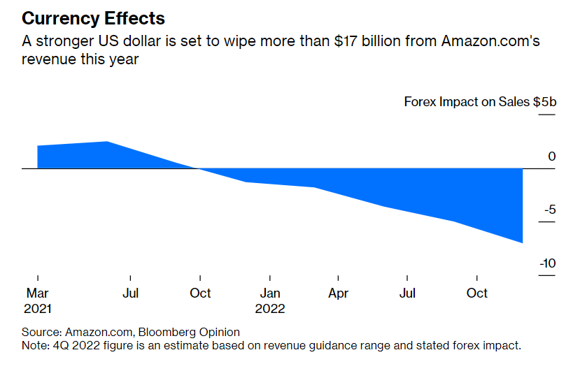 Un tema ricorrente negli utili di questa stagione è stato l’impatto di un dollaro forte sui risultati delle aziende. Amazon è stata tra le aziende più colpite.