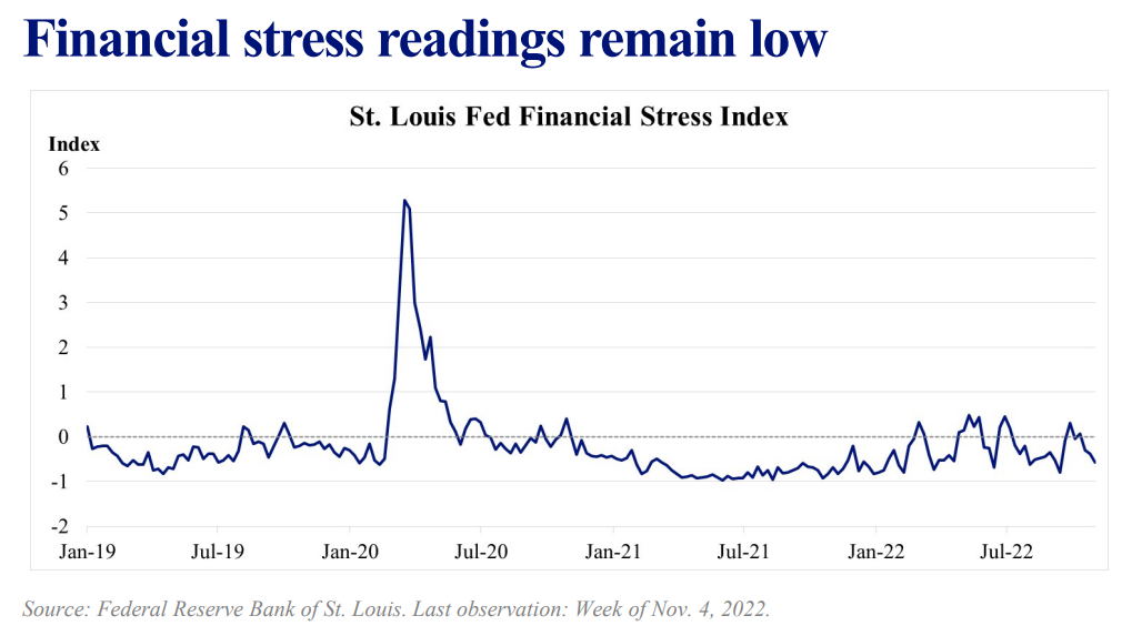 Tuttavia, la trasparenza con cui questi aumenti sono stati forniti, sembra aver consentito una transizione relativamente ordinata verso un livello più elevato di tassi di interesse. L’indice di stress finanziario della St. Louis Fed finora indica un livello relativamente basso di stress finanziario nonostante il tasso ufficiale più elevato di quest’anno.