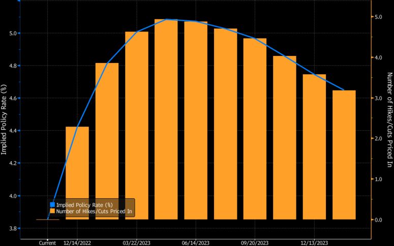 Le stime del picco dei tassi della Fed per il 2023 si sono estese al 5,10% alla riunione di maggio, un nuovo massimo per questo ciclo.