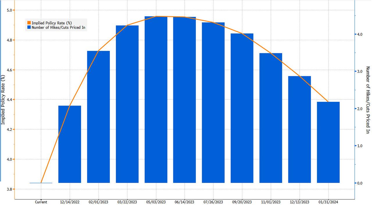 Gli swap hanno suggerito che il tasso terminale per questo ciclo sarà di circa il 4,94% a metà del 2023. Prima dei commenti di Powell, il mercato prevedeva un picco al di sopra del 5% a giugno del prossimo anno.