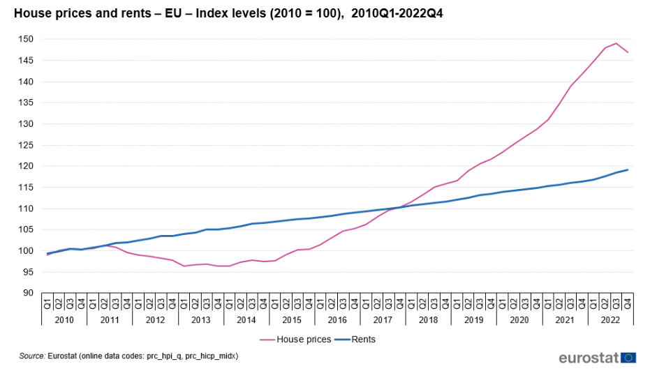 Dal 2010 fino al quarto trimestre del 2022, nell’UE, gli affitti sono aumentati del 19,2% e i prezzi delle case del 46,9%. Tuttavia, i prezzi delle case e gli affitti si sono evoluti in modo diverso. Mentre gli affitti sono aumentati costantemente durante questo periodo, i prezzi delle case hanno oscillato notevolmente.