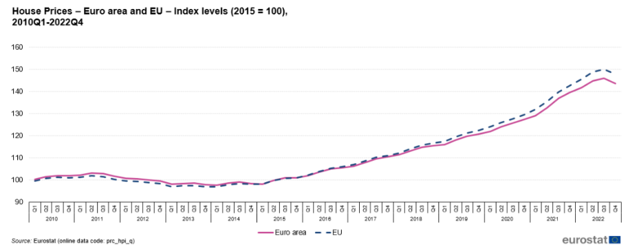 Secondo le proiezioni dell’Eurostat, sono in arrivo ulteriori cali dei prezzi delle case in Eurozona poiché la Banca centrale europea è ancora concentrata nella sua lotta all’inflazione. L’aumento dei tassi alza il costo dei prestiti e quindi anche il costo dei mutui per acquistare la casa. Proprio per questo si prevede un rapido deterioramento della domanda di mutui e degli investimenti residenziali, che potrebbe mettere a rischio il settore immobiliare. Anche le turbolenze nel sistema bancario potrebbero influire negativamente sulle condizioni di accesso al credito per consumatori e aziende.
