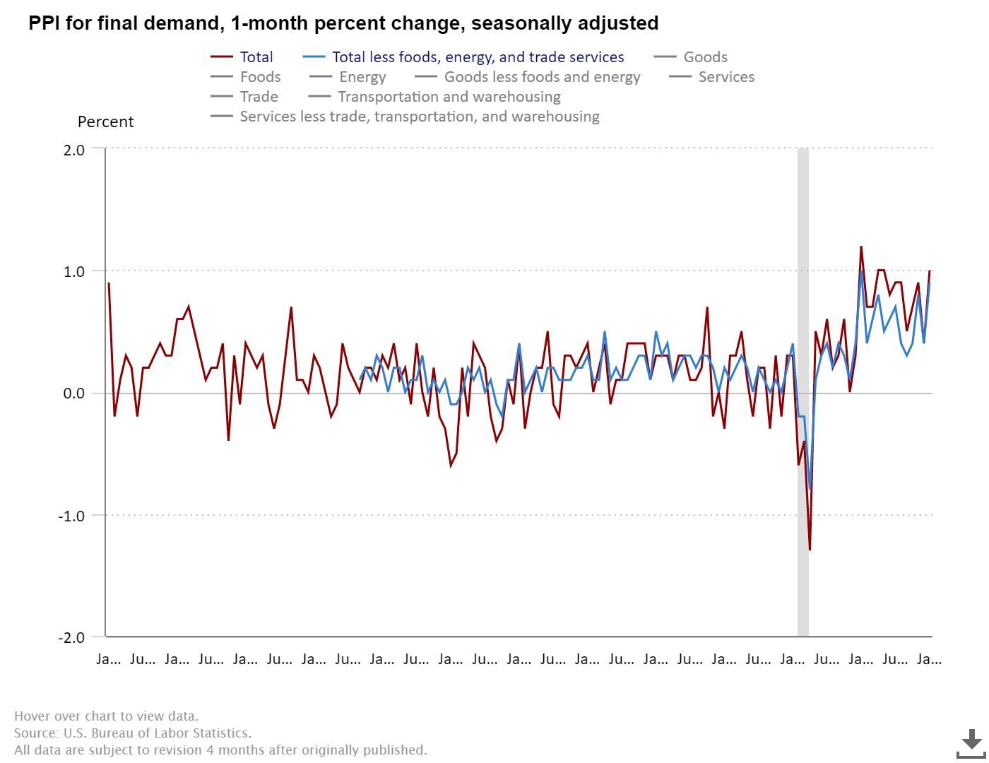 Il BLS pubblica informazioni mensili che includono la misurazione di quasi 10.000 prodotti coprendo quasi tutti i settori. Anche per il PPI esiste la misurazione “core” che esclude i prezzi dell’energia e dei prodotti alimentari.