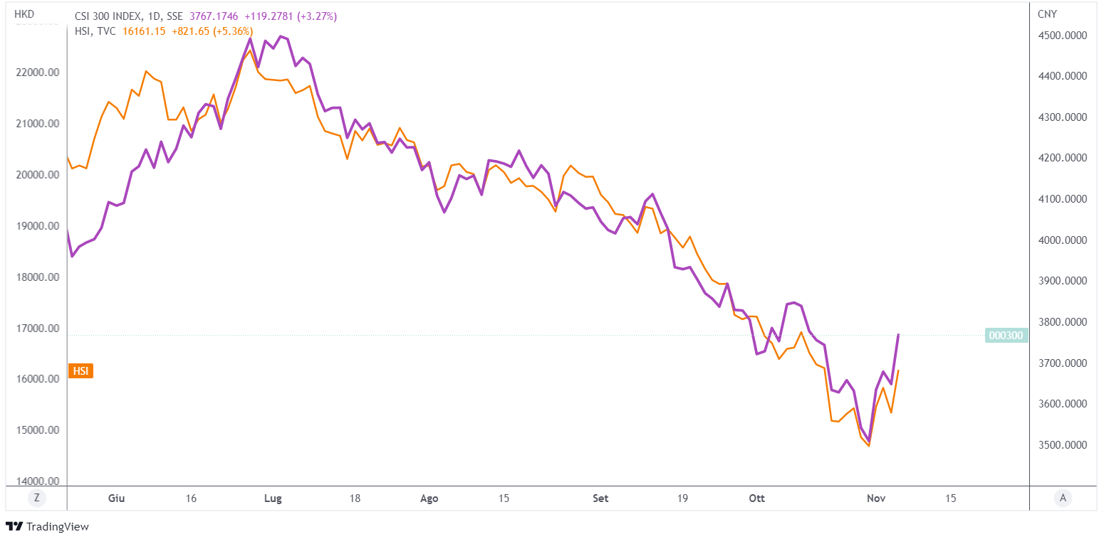 Con un rimbalzo di circa il 10% questa settimana, l’indice Hang Seng di Hong Kong è sulla buona strada per il miglior guadagno dal 2011. Anche l’indice CSI 300, il benchmark delle azioni continentali, è balzato di oltre il 3% venerdì.