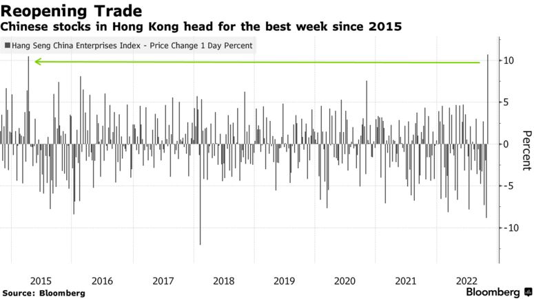 Le voci non verificate secondo cui la Cina è pronta a uscire dalla sua rigida politica Covid Zero hanno agito da catalizzatori per il rally delle azioni cinesi. L’indice Hang Seng China Enterprises è sulla buona strada per la sua migliore settimana dal 2015.