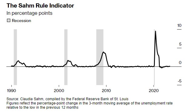 La regola di Sahm sostiene che l’economia tende a entrare in recessione quando la media mobile trimestrale del tasso di disoccupazione aumenta di 0,5 punti percentuali rispetto al minimo dei 12 mesi precedenti.