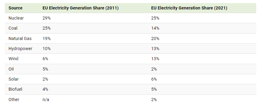 Nell’ultimo decennio, l’Europa ha compiuto notevoli progressi sul fronte delle energie rinnovabili. Nel 2011, i combustibili fossili (petrolio, gas naturale e carbone) costituivano il 49% della produzione di elettricità dell’UE, mentre le fonti energetiche rinnovabili costituivano solo il 18%. Oggi, le fonti energetiche rinnovabili rappresentano il 32% della produzione di elettricità dell’UE, contro il 36% dei combustibili fossili.