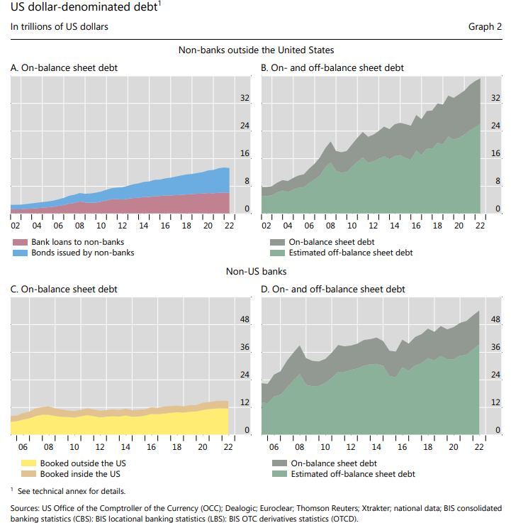 Il debito in dollari fuori bilancio di soggetti non bancari al di fuori degli Stati Uniti supera notevolmente quello “on-balance sheet” e sta crescendo rapidamente. A fine giugno 2022, il debito “mancante” ammontava a ben il doppio di quello registrato nei bilanci, il quale è stato stimato a 13 trilioni di dollari.