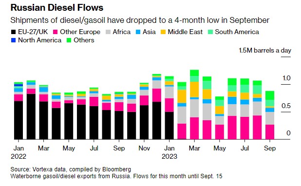 Le spedizioni di diesel e gasolio della nazione sono scese al minimo di 4 mesi a settembre, con Turchia, Brasile e Arabia Saudita tra le principali destinazioni. Prima dell’invasione dell’Ucraina, i barili di diesel esportati via mare dalla Russia venivano spediti principalmente verso le nazioni europee. Ma l’imposizione delle sanzioni ha sconvolto i flussi commerciali globali.