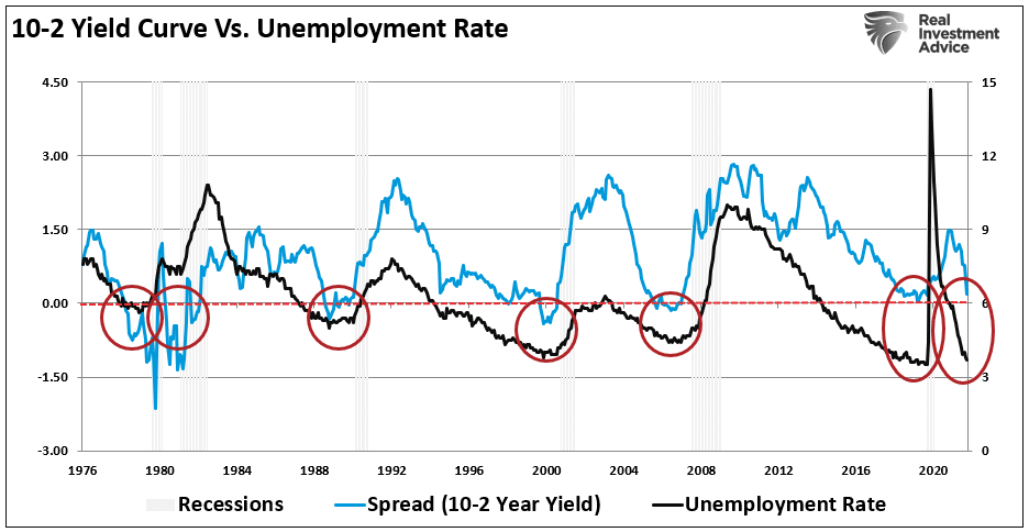L’inflazione elevata e la bassa disoccupazione suggeriscono che progettare un soft landing sarà molto difficile per la Fed. Entrambi questi indicatori sono dei forti predittori di future recessioni. Dagli anni ’50, ogni volta che l’inflazione ha superato il 4% e la disoccupazione è stata inferiore al 5%, l’economia statunitense è entrata in recessione nel giro di due anni.