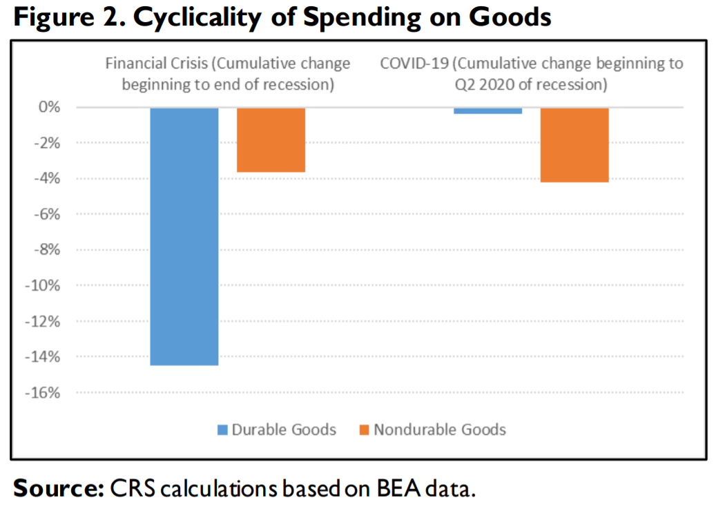 I modelli di consumo sono strettamente collegati ai cicli economici. Durante una recessione, la spesa dei consumatori diminuisce poichè c’è meno fiducia, la disoccupazione aumenta ed è più difficile accedere al credito. La spesa che viene più colpita durante la recessione è quella per i beni durevoli, come i veicoli, gli elettrodomestici e altre apparecchiature. Viceversa, i beni durevoli sono quelli che registrano i maggiori aumenti durante i cicli di espansione economica. In generale, la spesa dei consumatori per i beni durevoli è più ciclica di quella per i beni non durevoli, (beni che vengono consumati in breve tempo). In altre parole, la spesa per beni durevoli dovrebbe diminuire di più durante una recessione rispetto a quella per i non durevoli. Questo perché gli individui hanno la capacità di rimandare i grandi acquisti e pensano principalmente ad acquistare beni di prima necessità.
